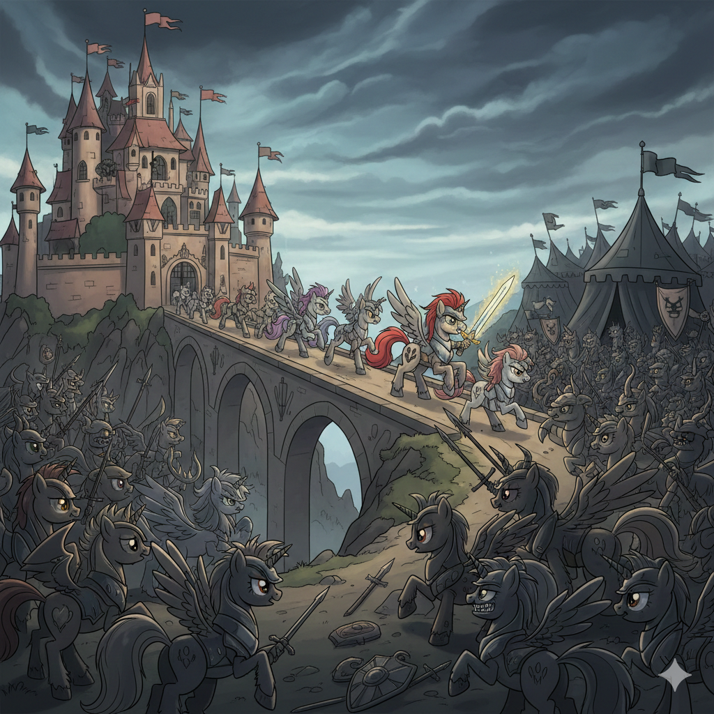 >>21958 well... the general prompt was interpreted fine. It's the 'hands' sticking out of the ponies' necks and holding the weapons that are a little unusual.