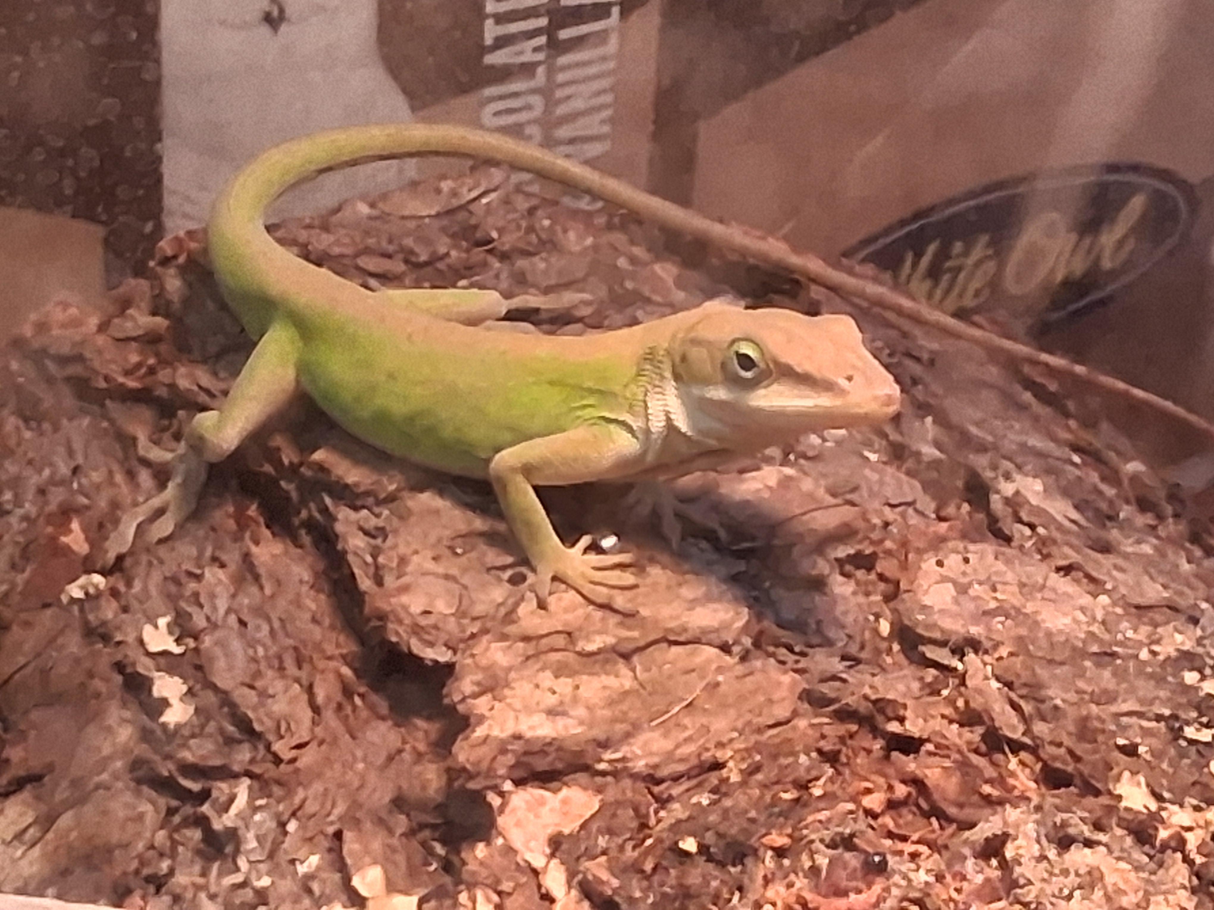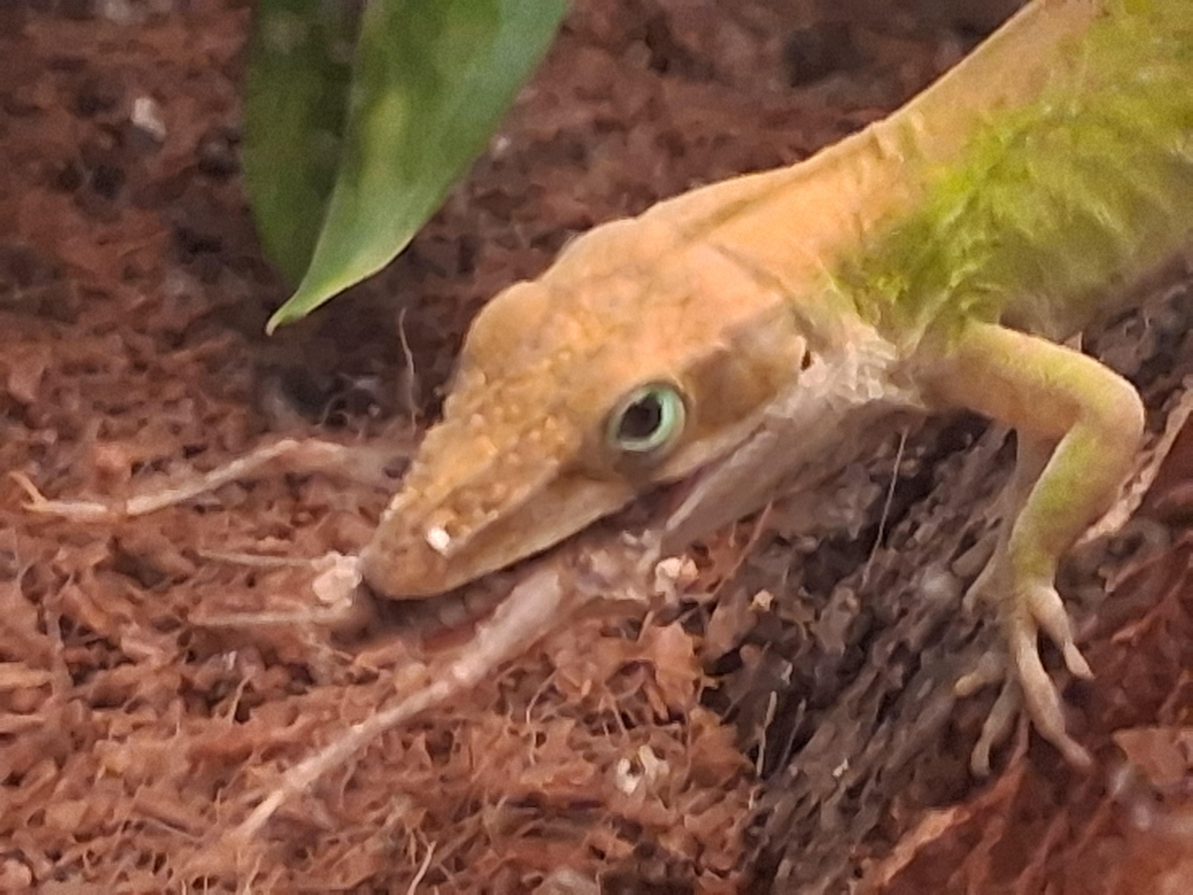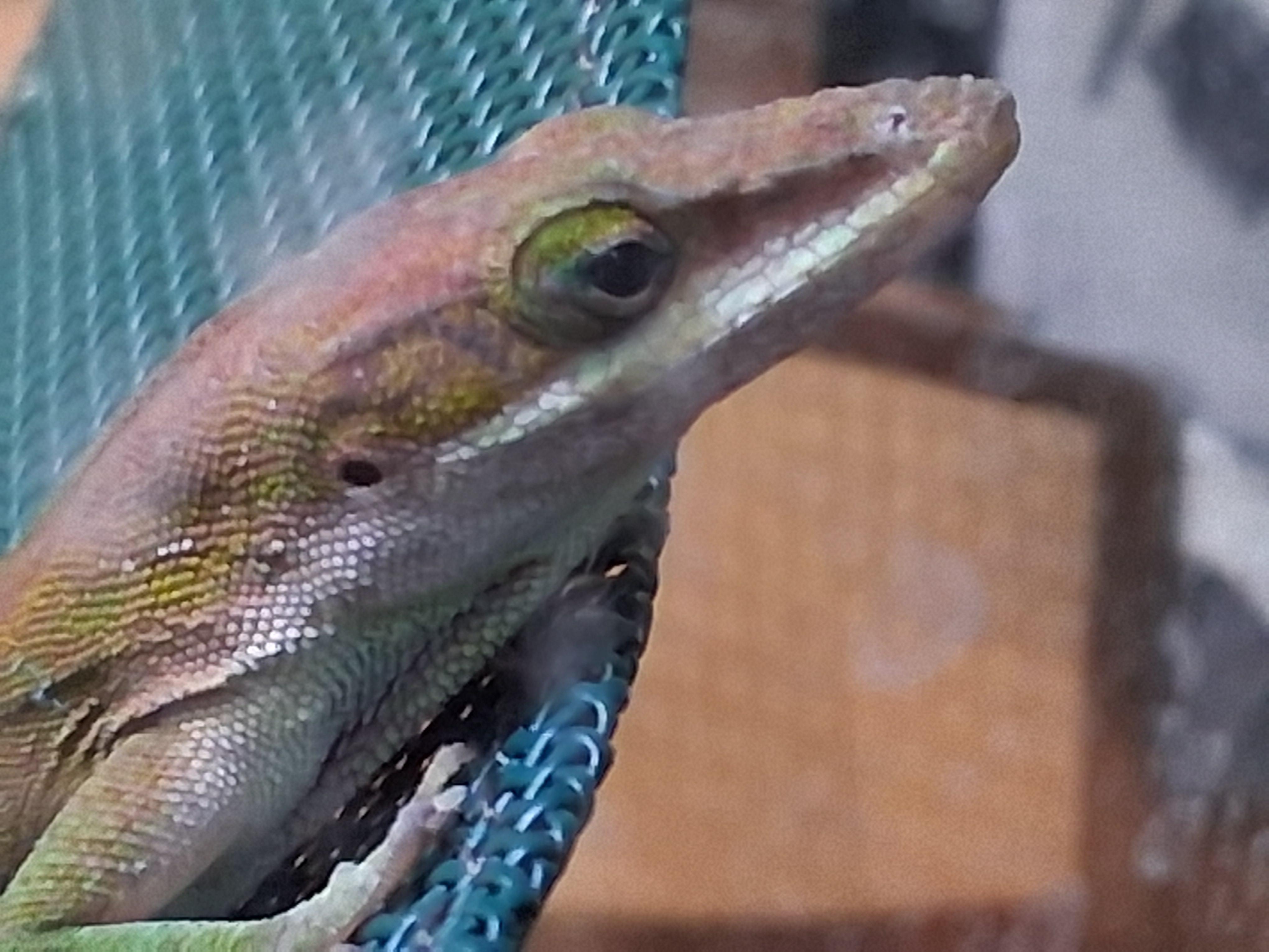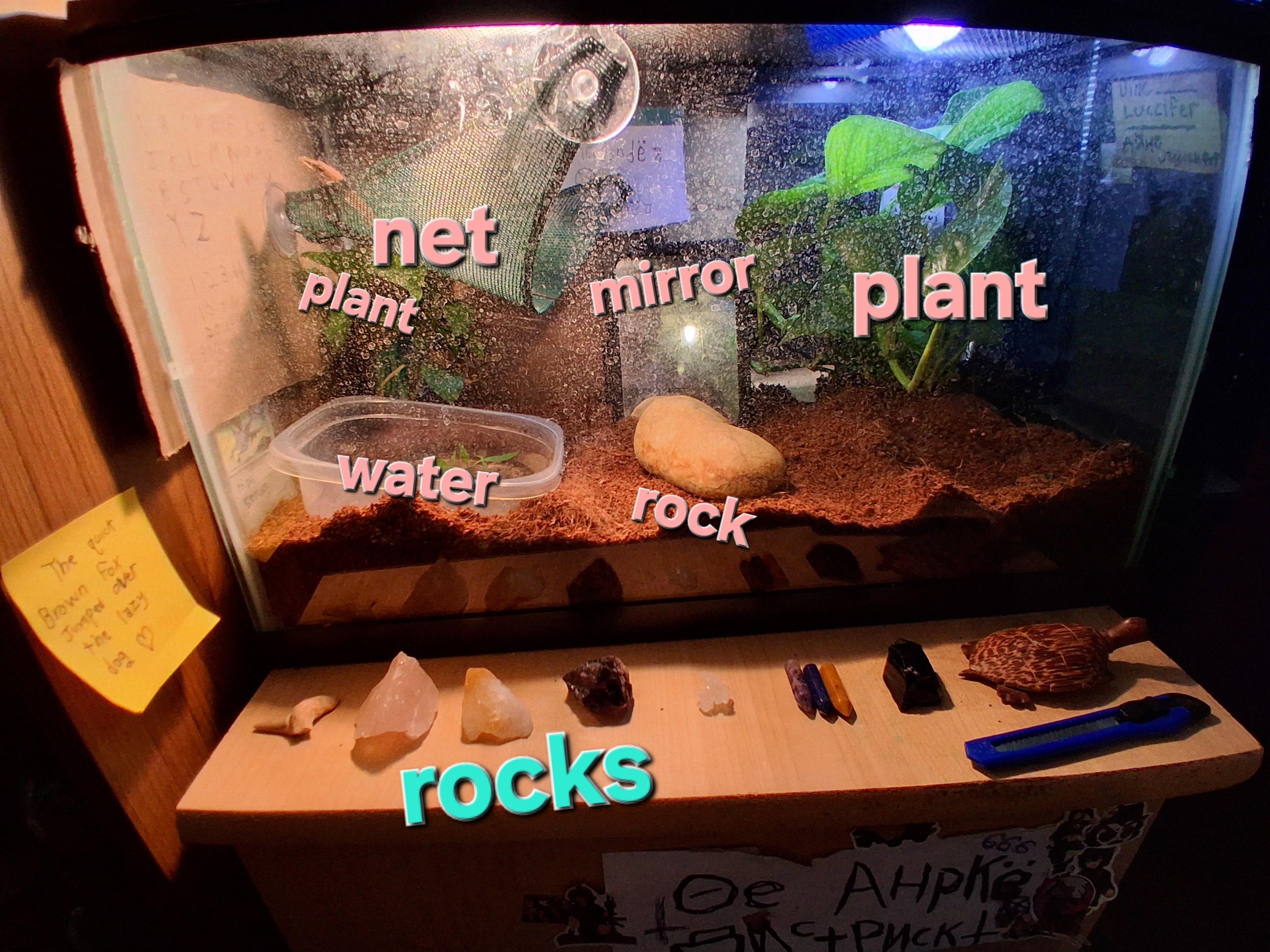 Anyway, he's needed like a hundred dollars of love poured into his new cage, but i love him greatly and am grateful for every bit of help making his life possible. He needs both a heat lamp and a UVB bulb. He eats live crickets from a pet store and I have to mist his cage every day.