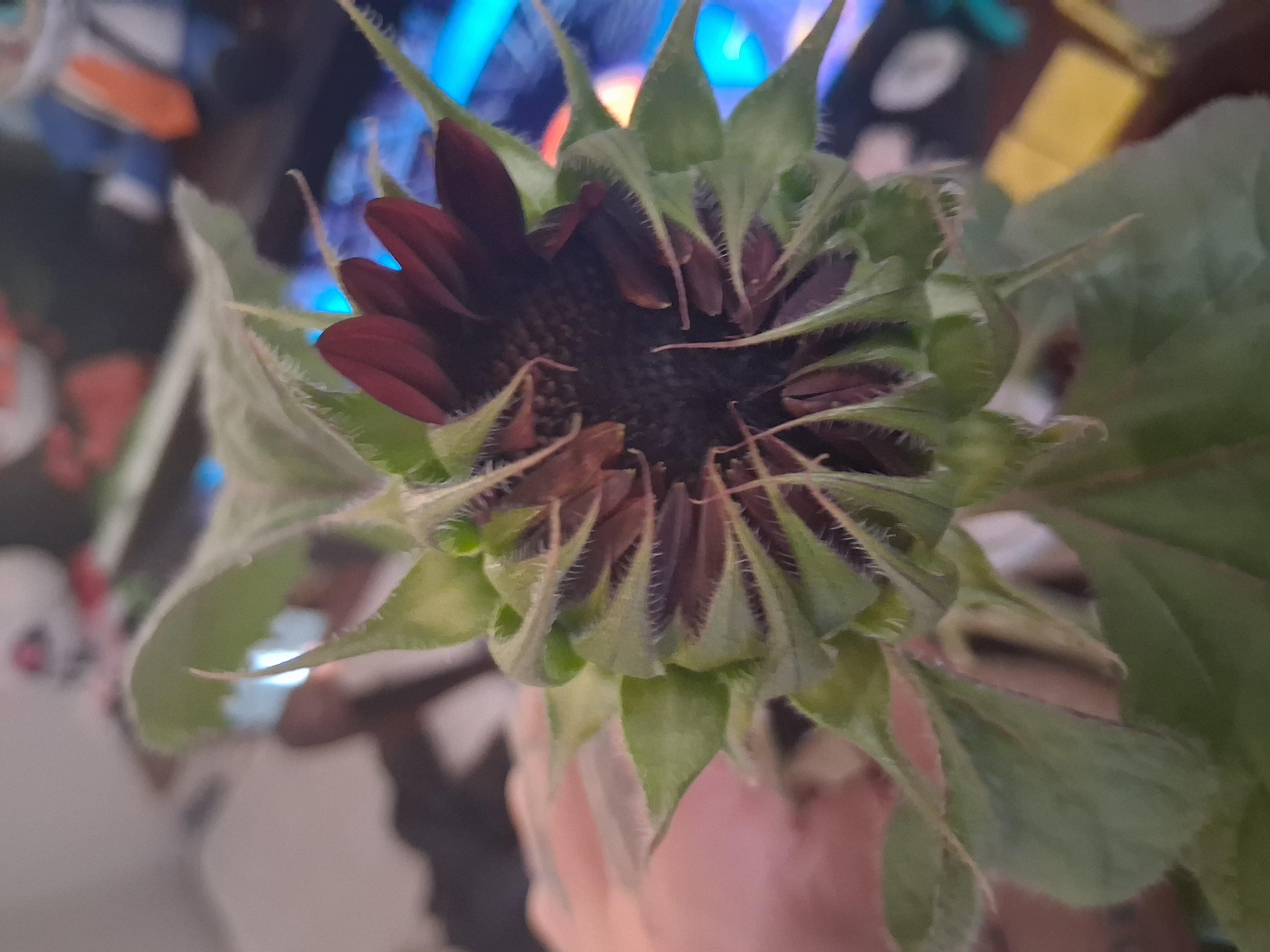 This is my black cherry sunflower that is just now blooming. I call it an anti sunflower as if it was made of dark matter.